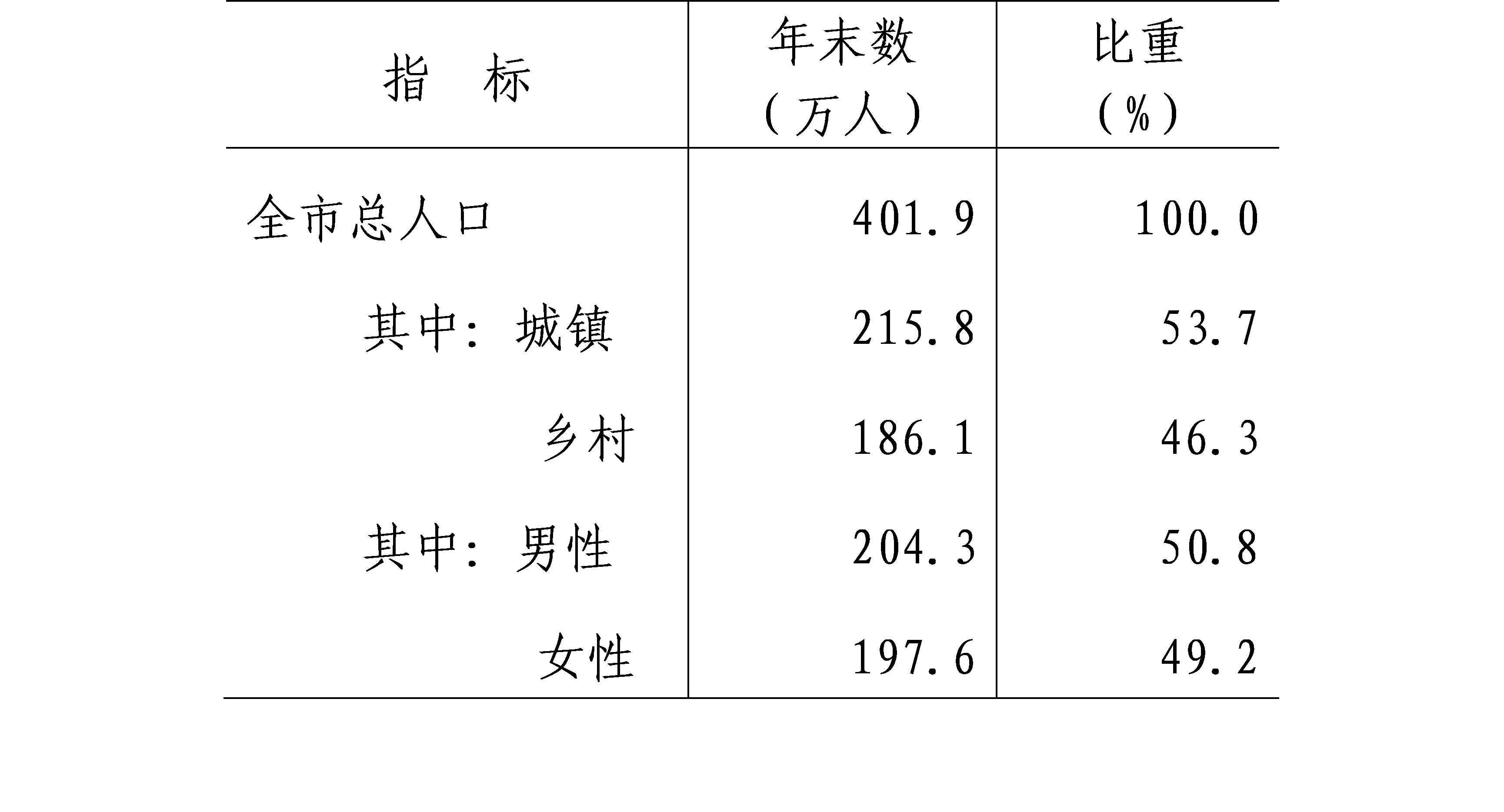 年末全市常住人口401.9万人,比上年末减少1.2万人。其中,城镇人口215.8万人,乡村人口186.1万人;常住人口城镇化率达53.7%,比上年增长0.6个百分点。男性人口204.3万人,女性人口197.6万人。全年出生人口2.7万人,出生率6.8‰;死亡人口3.1万人,死亡率为7.7‰。
