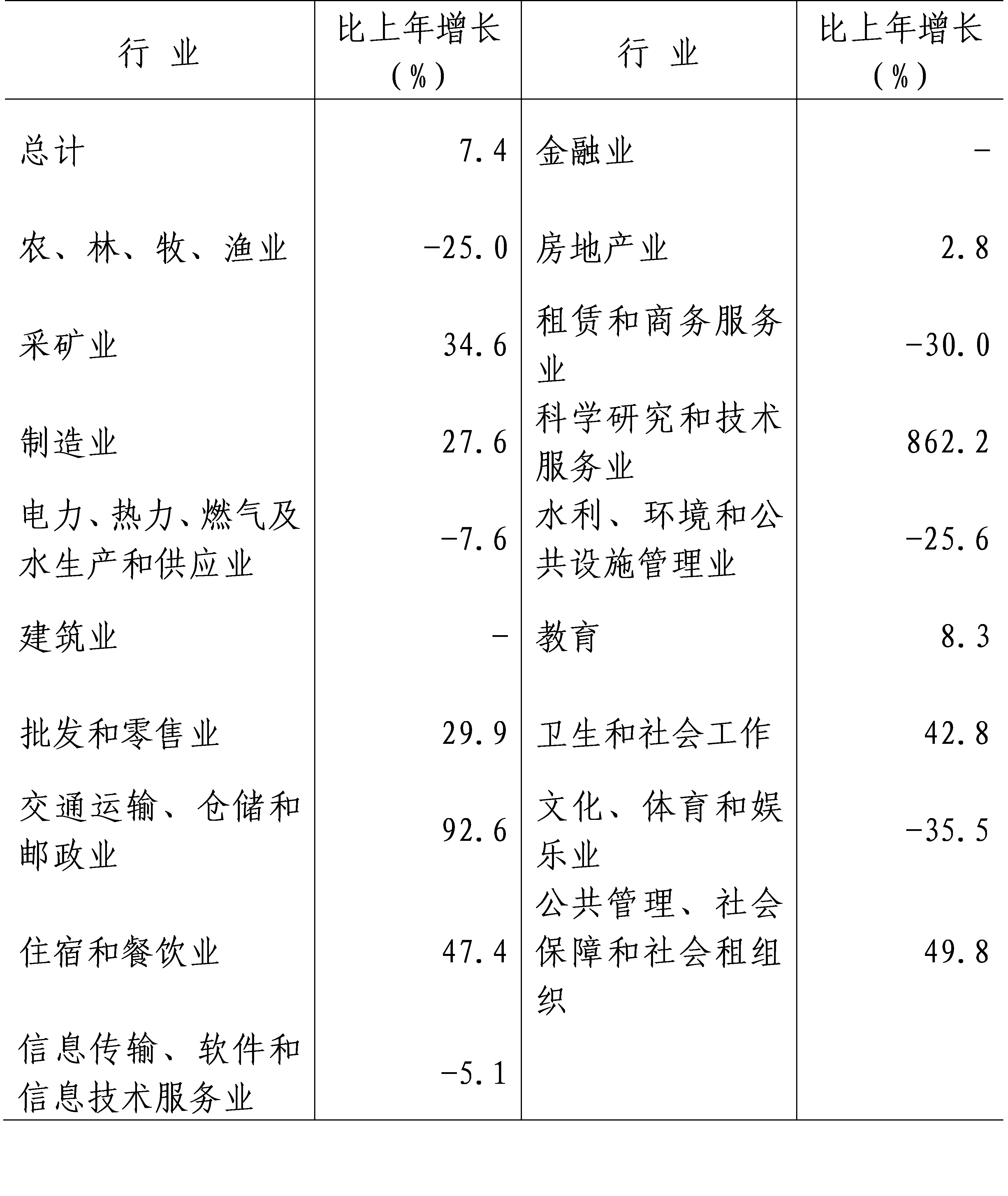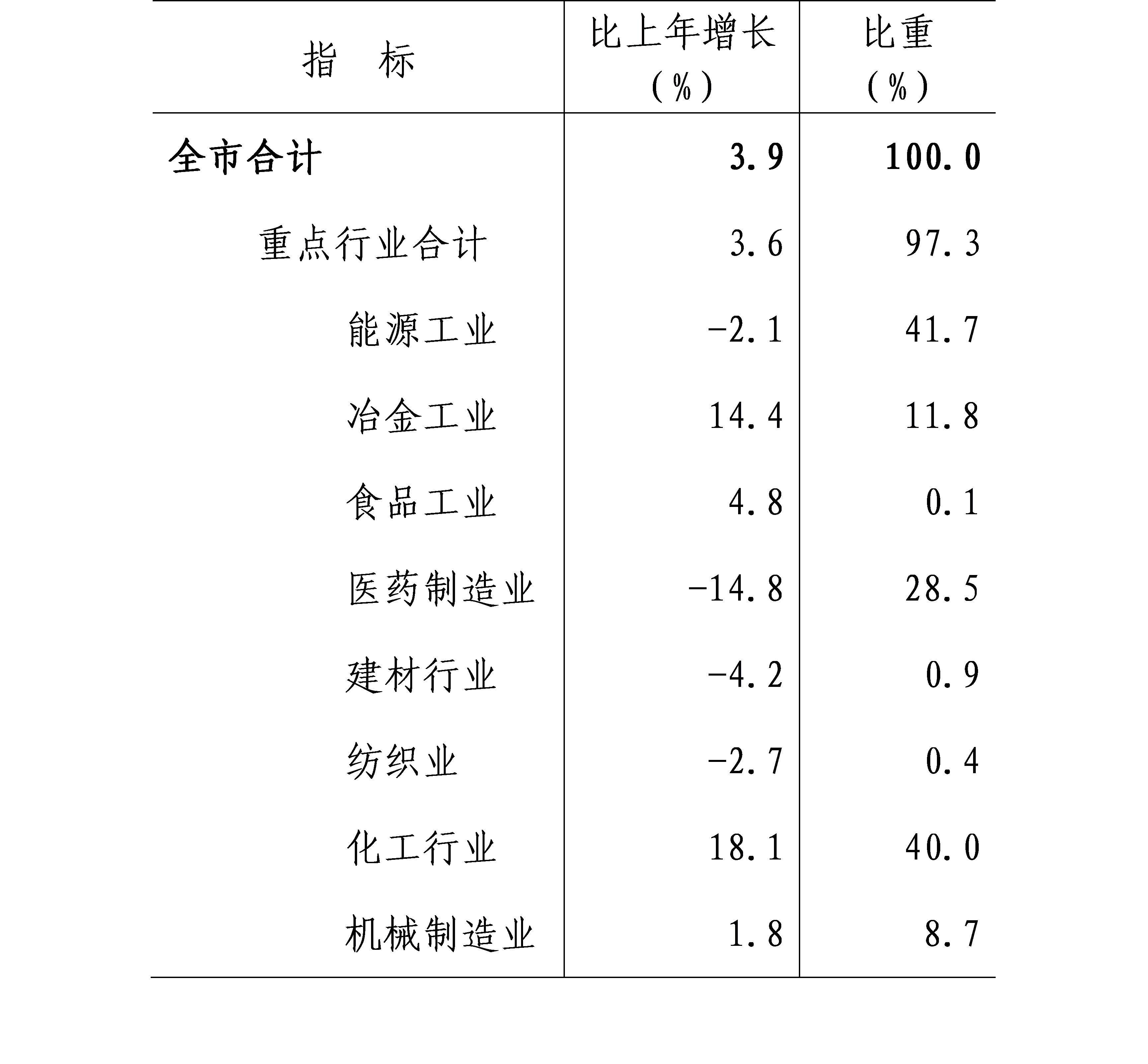 全年全部工业增加值比上年增长4.2%。其中,规模以上工业增加值增长3.9%。在规模以上工业中,分经济类型看,国有及国有控股企业增长9.3%,股份制企业增长4.5%,外商及港澳台投资企业下降27.2%。分门类看,采矿业增长6.8%,制造业增长11.2%,电力、热力、燃气及水生产和供应业下降7.1%。分轻重工业看,轻工业增长2.6%,重工业增长4%。冶金、能源、食品、医药制造、建材、纺织、化工和机械制造等八个重点行业增加值增长3.6%,对规模以上工业的贡献率为90.4%,拉动规模以上工业增长3.5个百分点。