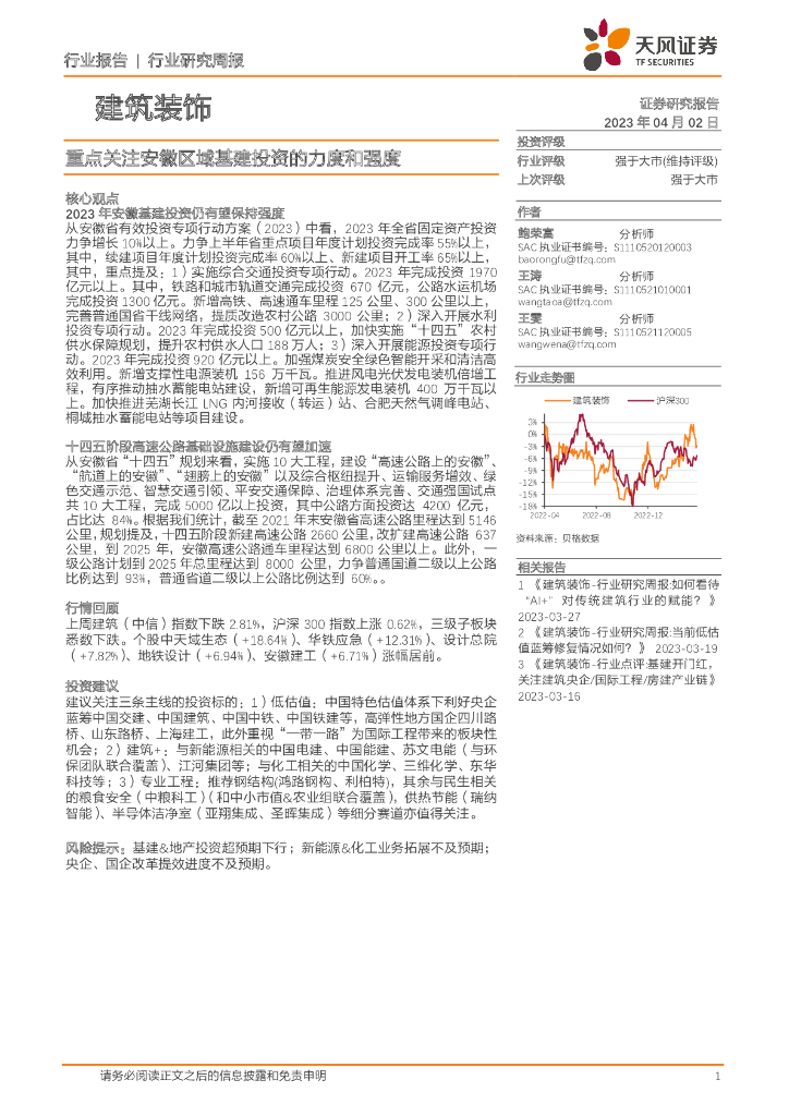 天风证券:建筑装饰行业研究周报:重点关注安徽区域基建投资的力度和强度.pdf