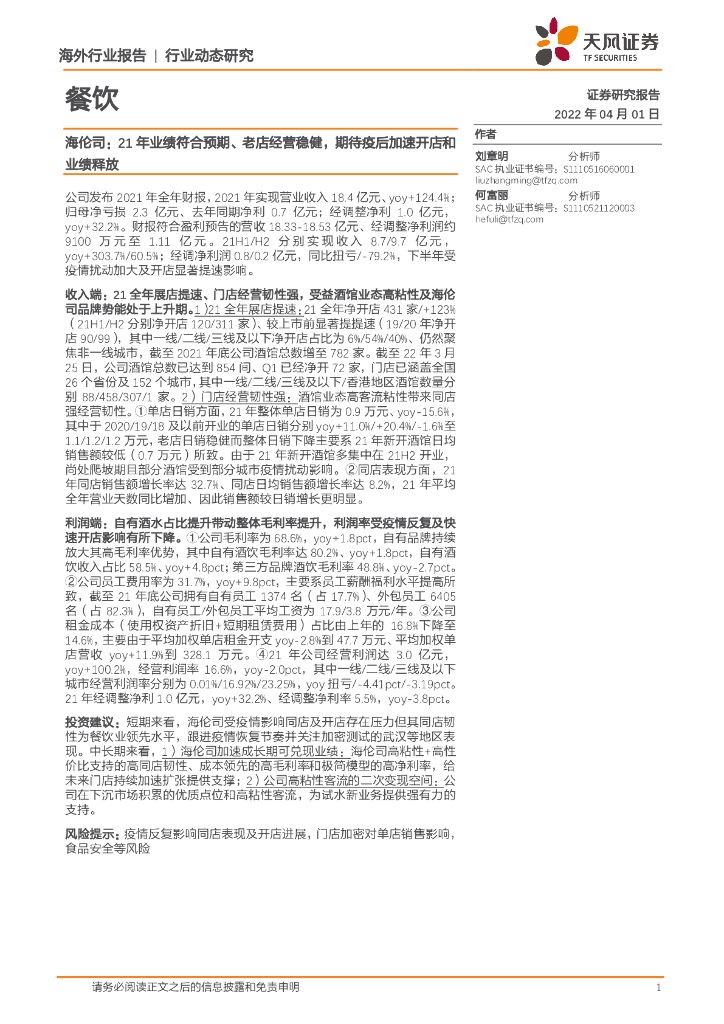 天风证券:海伦司:21年业绩符合预期、老店经营稳健,期待疫后加速开店和业绩释放.pdf
