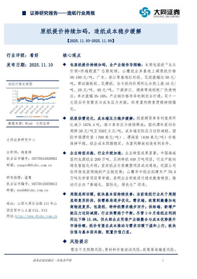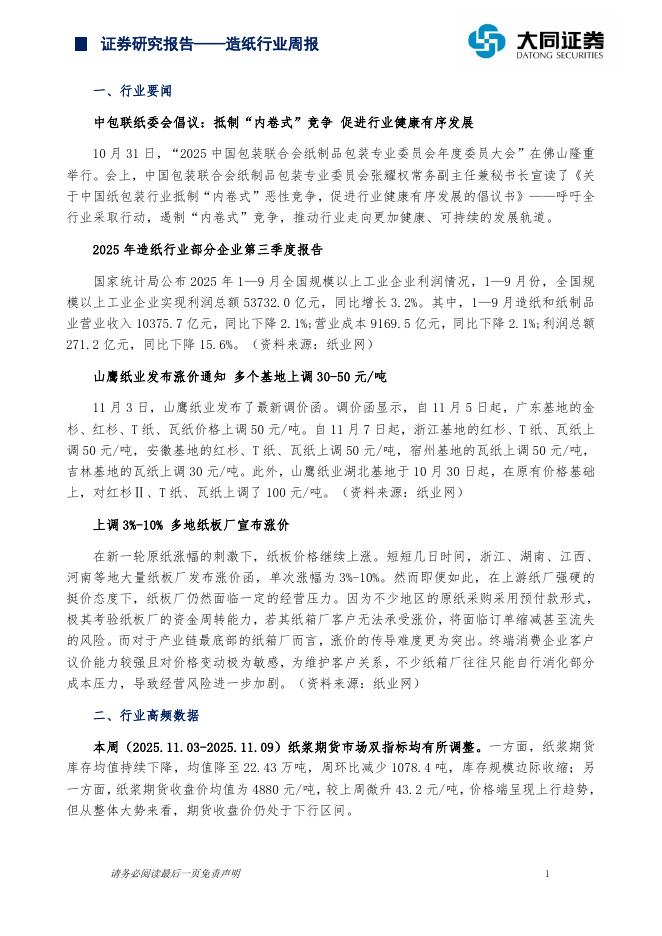 大同证券:造纸行业周报:原纸提价持续加码,造纸成本稳步缓解.pdf