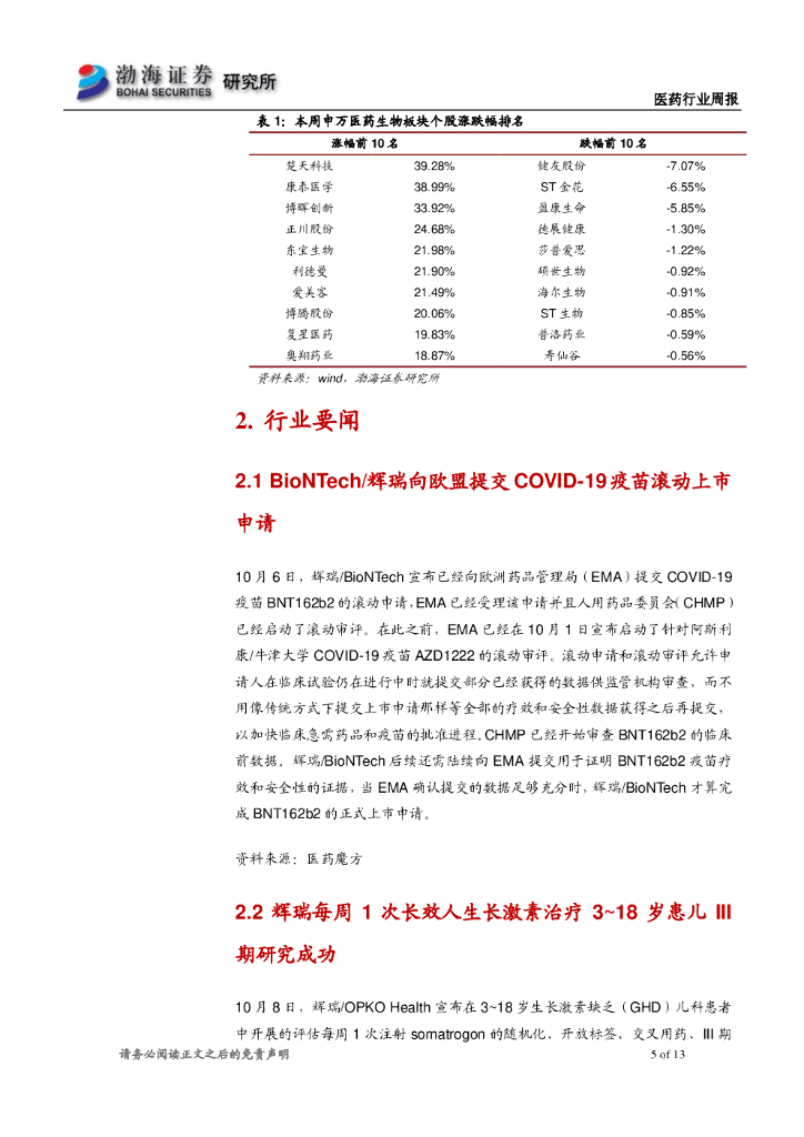 渤海证券:医药行业周报:三季报进入披露期,关注疫情动态和三季度业绩.pdf