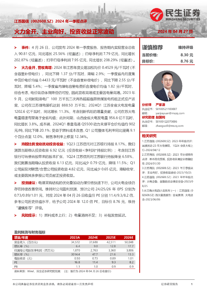 民生证券:江苏国信(002608)-2024年一季报点评:火力全开、主业向好,投资收益正常波动.pdf