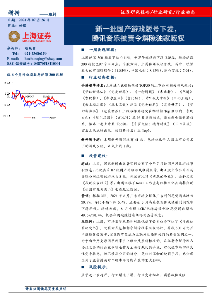 上海证券:传媒行业动态:新一批国产游戏版号下发,腾讯音乐被责令解除独家版权.pdf