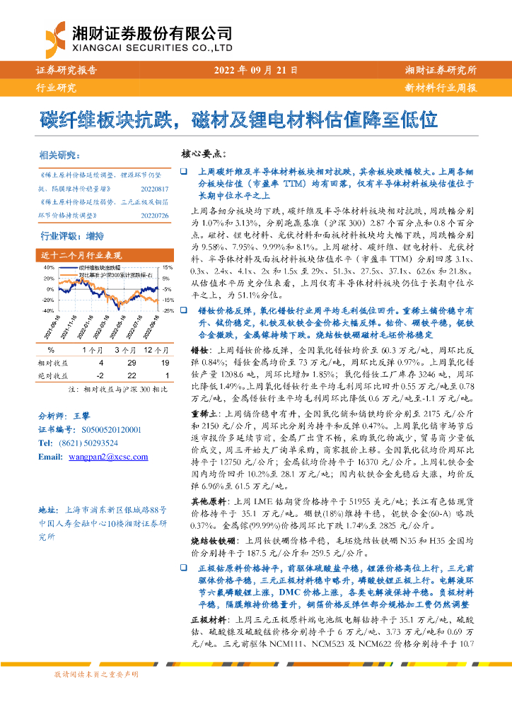 湘财证券:新材料行业周报:碳纤维板块抗跌,磁材及锂电材料估值降至低位.pdf
