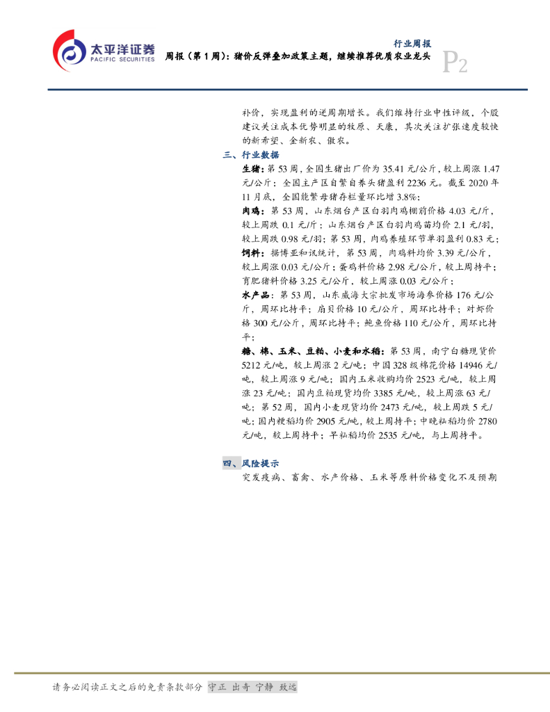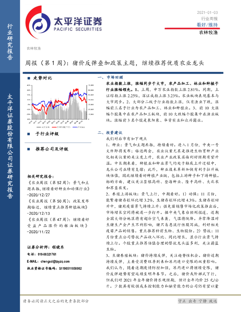 太平洋证券:农林牧渔周报(第1周):猪价反弹叠加政策主题,继续推荐优质农业龙头.pdf