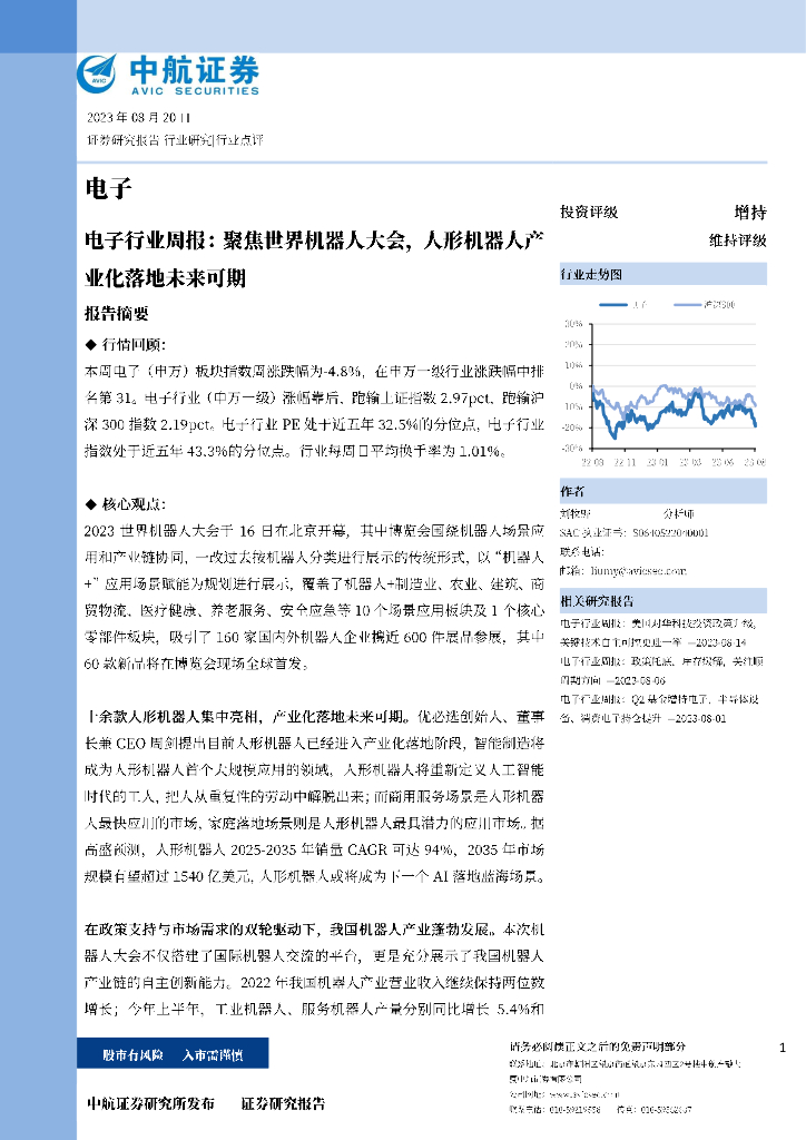 中航证券:电子行业周报:聚焦世界机器人大会,人形机器人产业化落地未来可期.pdf