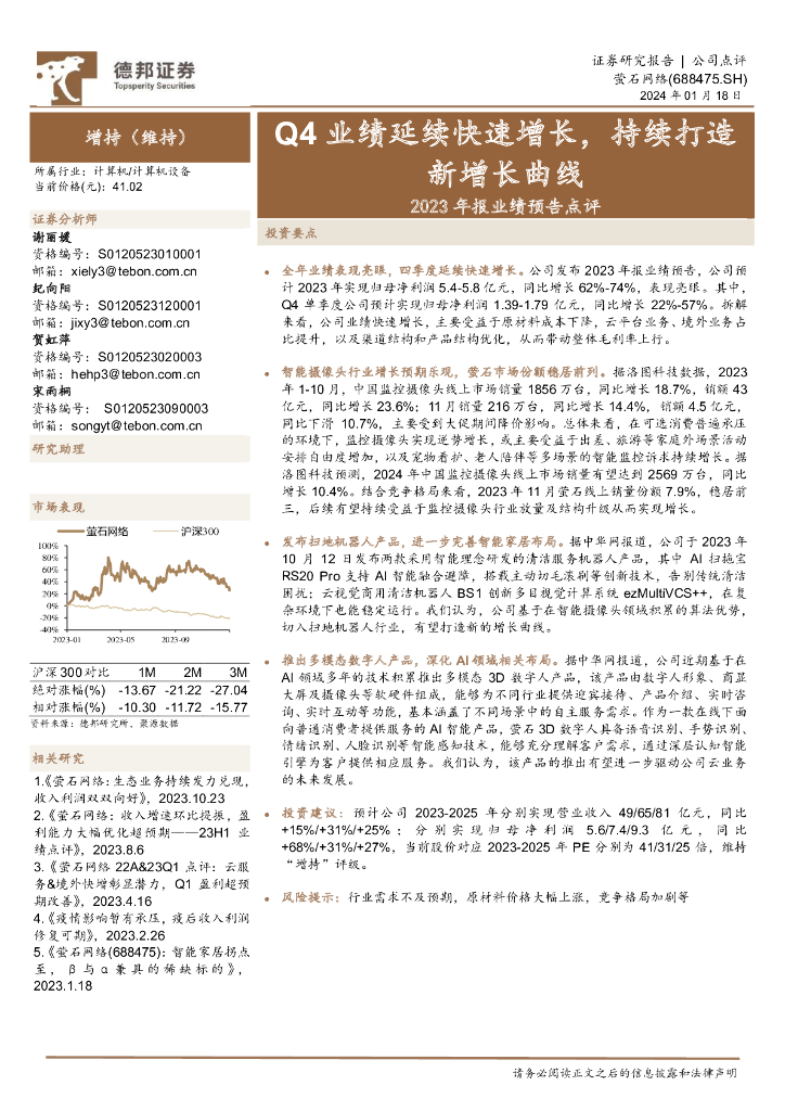 德邦证券:萤石网络(688475)-2023年报业绩预告点评:Q4业绩延续快速增长,持续打造新增长曲线.pdf