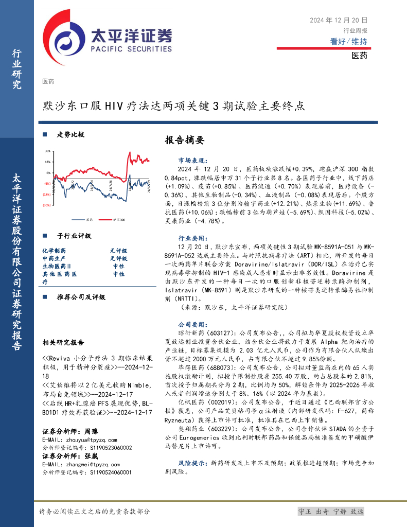 太平洋证券:医药行业周报:默沙东口服HIV疗法达两项关键3期试验主要终点.pdf