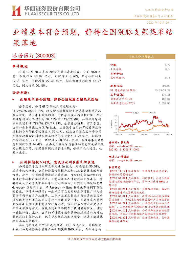 华西证券:乐普医疗(300003)-业绩基本符合预期,静待全国冠脉支架集采结果落地.pdf