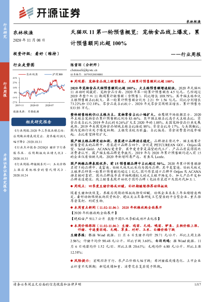 开源证券:农林牧渔行业周报:天猫双11第一轮预售概览:宠物食品线上爆发,累计预售额同比超100%.pdf