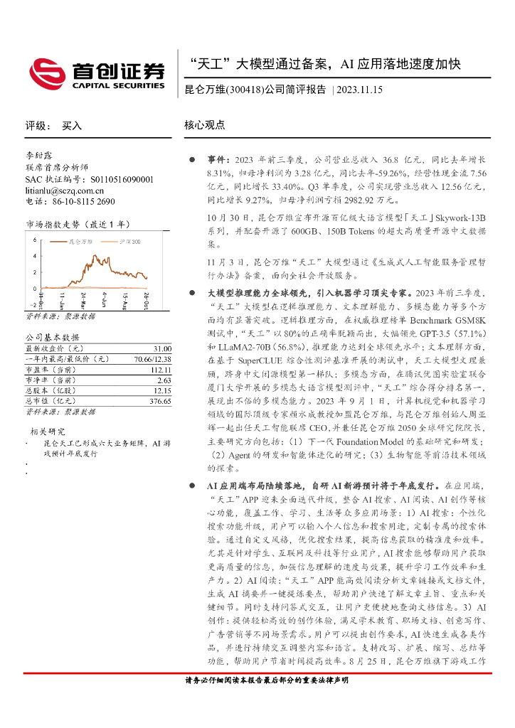 首创证券:昆仑万维(300418)-公司简评报告:“天工”大模型通过备案,AI应用落地速度加快.pdf