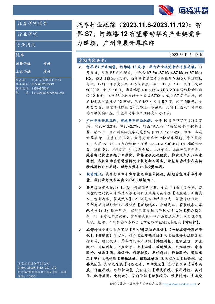 信达证券:汽车行业跟踪:智界S7、阿维塔12有望带动华为产业链竞争力延续,广州车展开幕在即.pdf