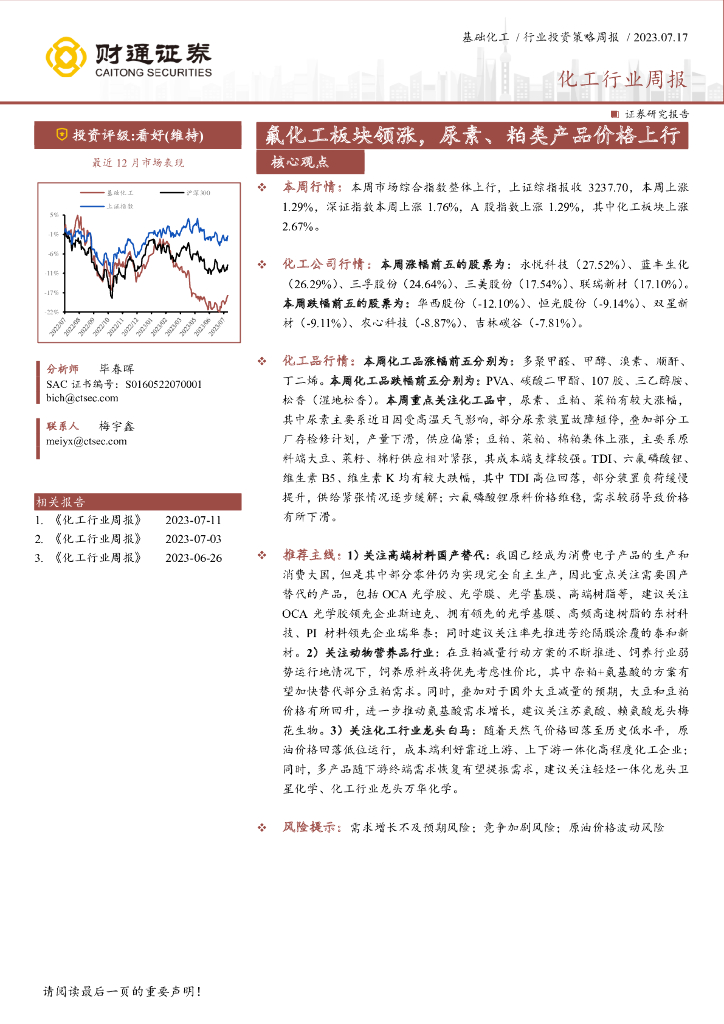 财通证券:化工行业周报:氟化工板块领涨,尿素、粕类产品价格上行.pdf