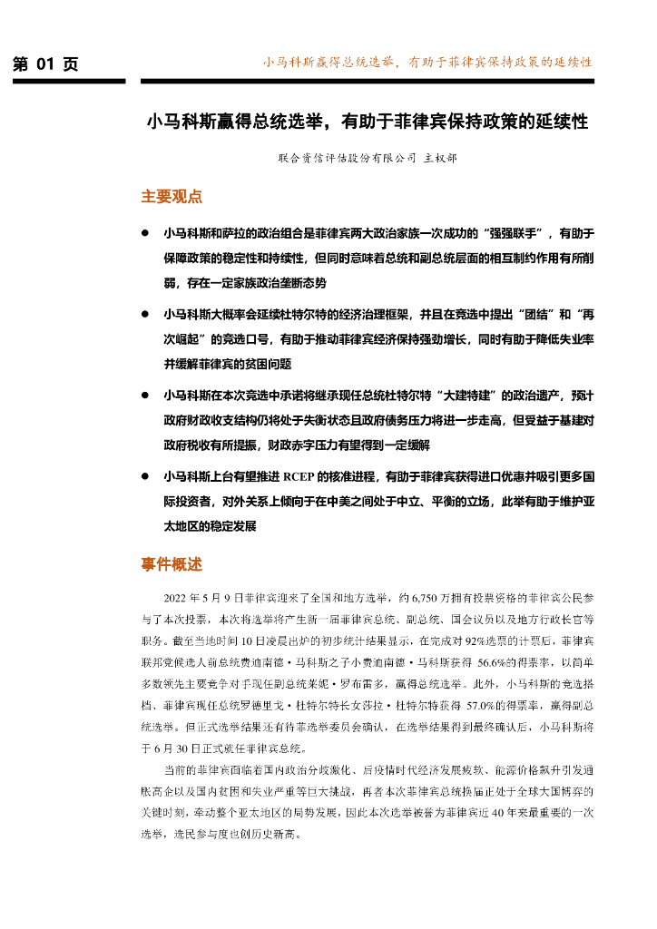 联合资信:小马科斯赢得总统选举,有助于菲律宾保持政策的延续性.pdf