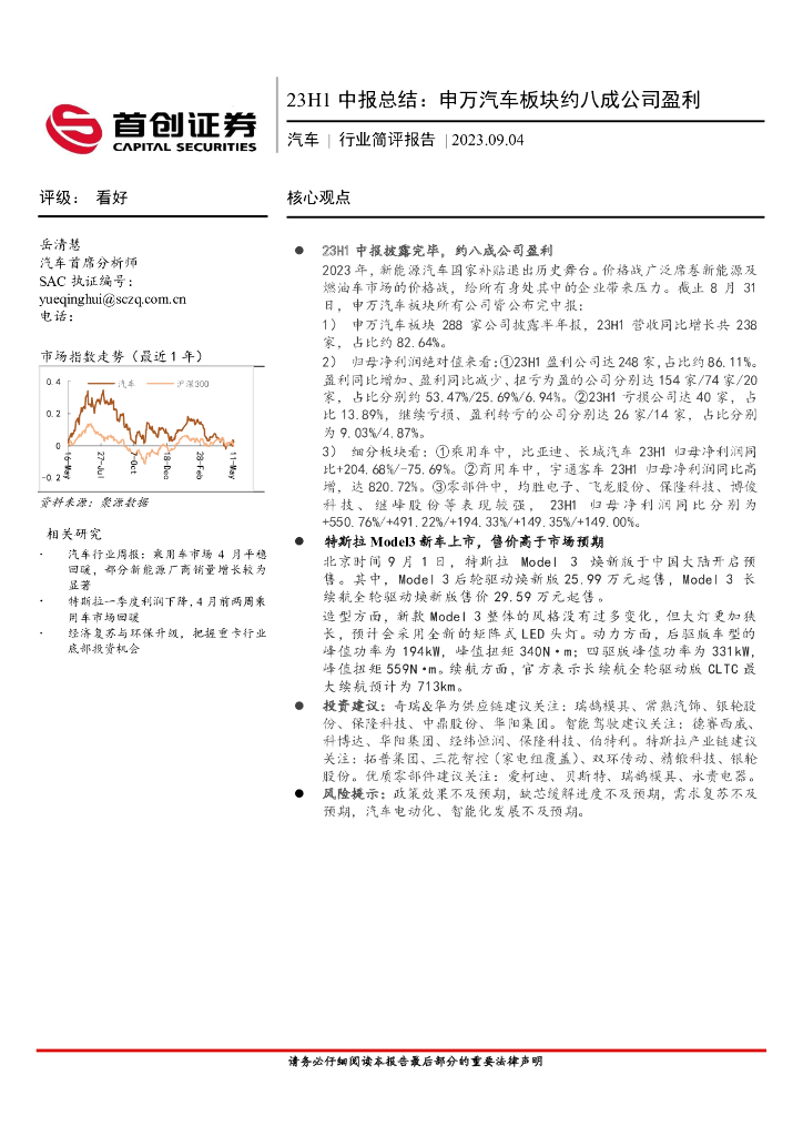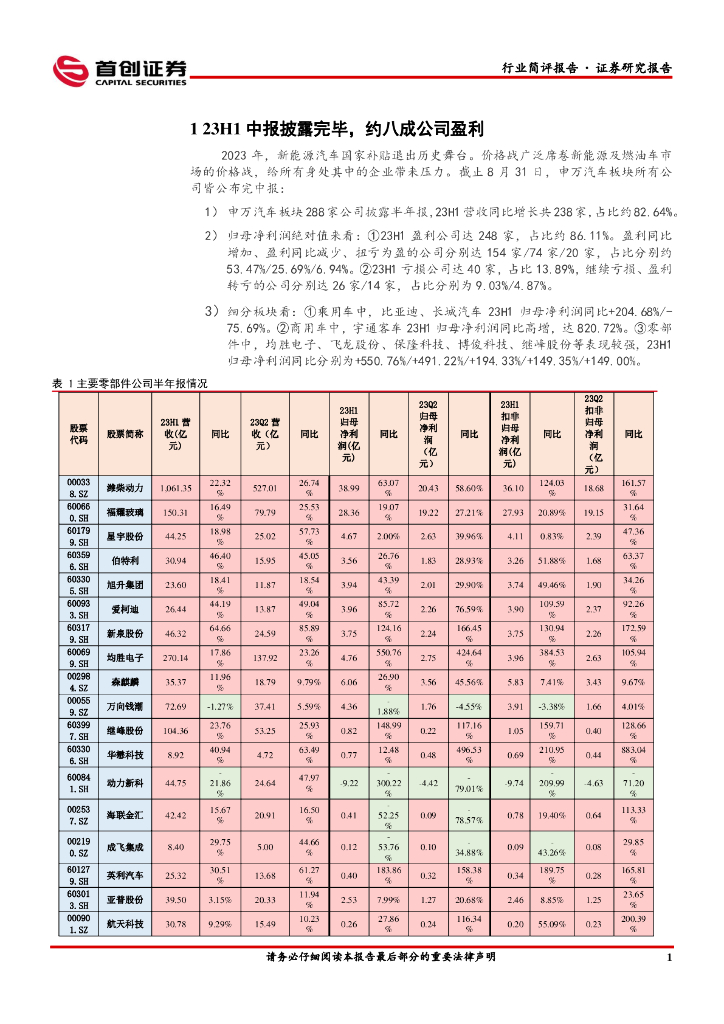 首创证券:汽车行业简评报告:23H1中报总结:申万汽车板块约八成公司盈利.pdf