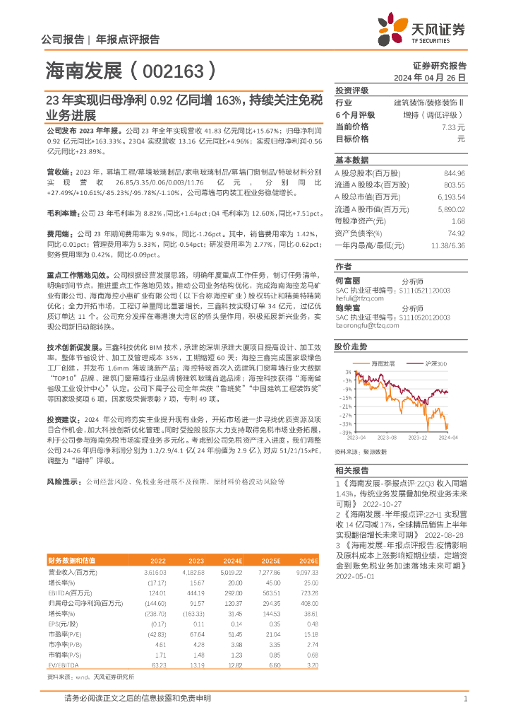 天风证券:海南发展(002163)-年报点评报告:23年实现归母净利0.92亿同增163%,持续关注免税业务进展.pdf
