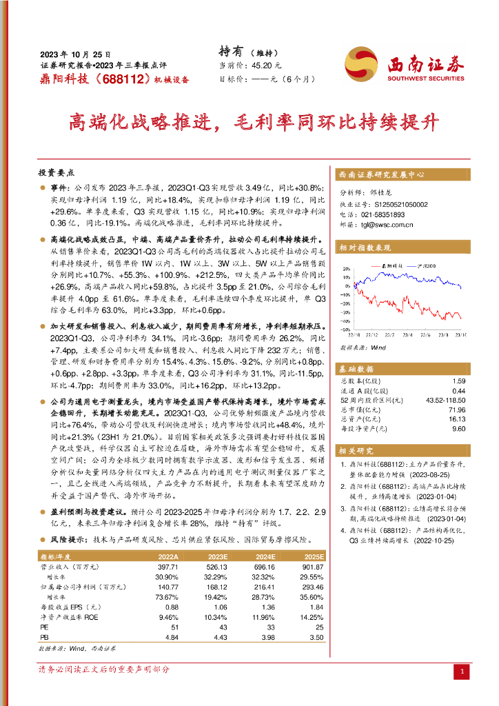 西南证券:鼎阳科技(688112)-2023年三季报点评:高端化战略推进,毛利率同环比持续提升.pdf