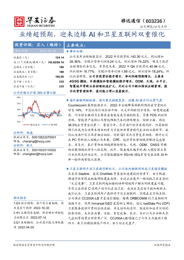 华安证券:移远通信(603236)-业绩超预期,迎来边缘AI和卫星互联网双重催化.pdf