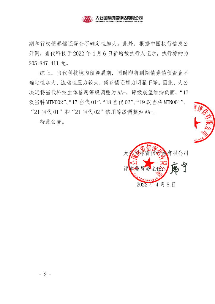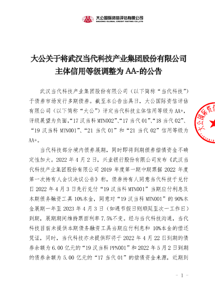 大公:大公关于将武汉当代科技产业集团股份有限公司主体信用等级调整为AA-的公告.pdf