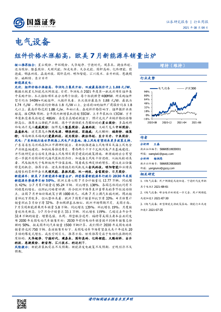国盛证券:电气设备行业周报:组件价格水涨船高,欧美7月新能源车销量出炉.pdf