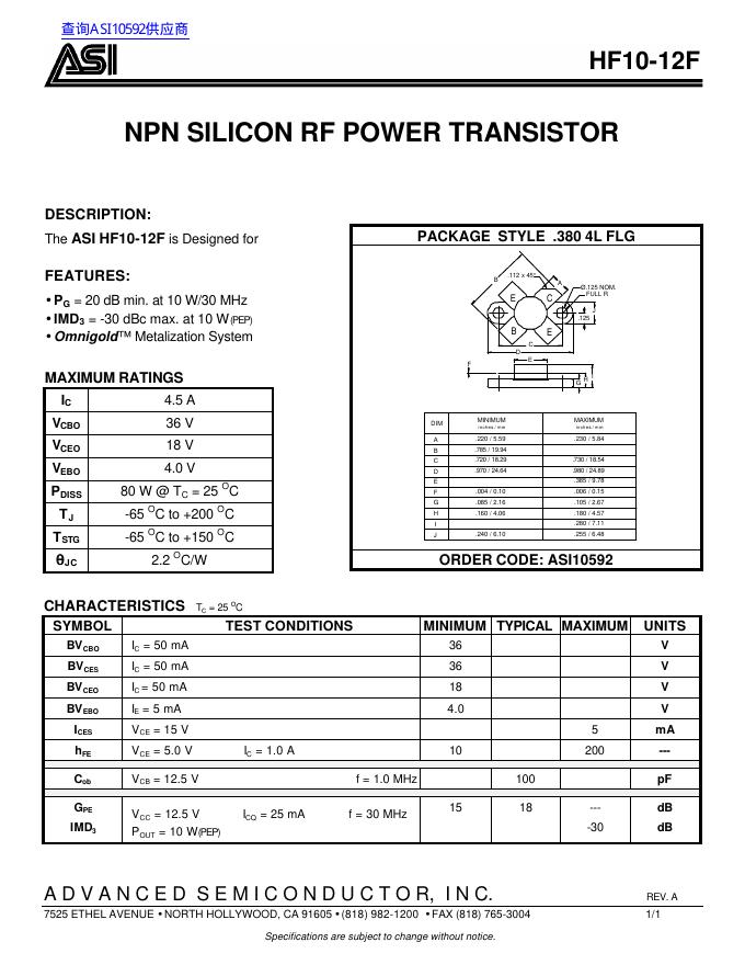 NPN SILICON RF POWER TRANSISTOR HF10-12F 数据手册.pdf