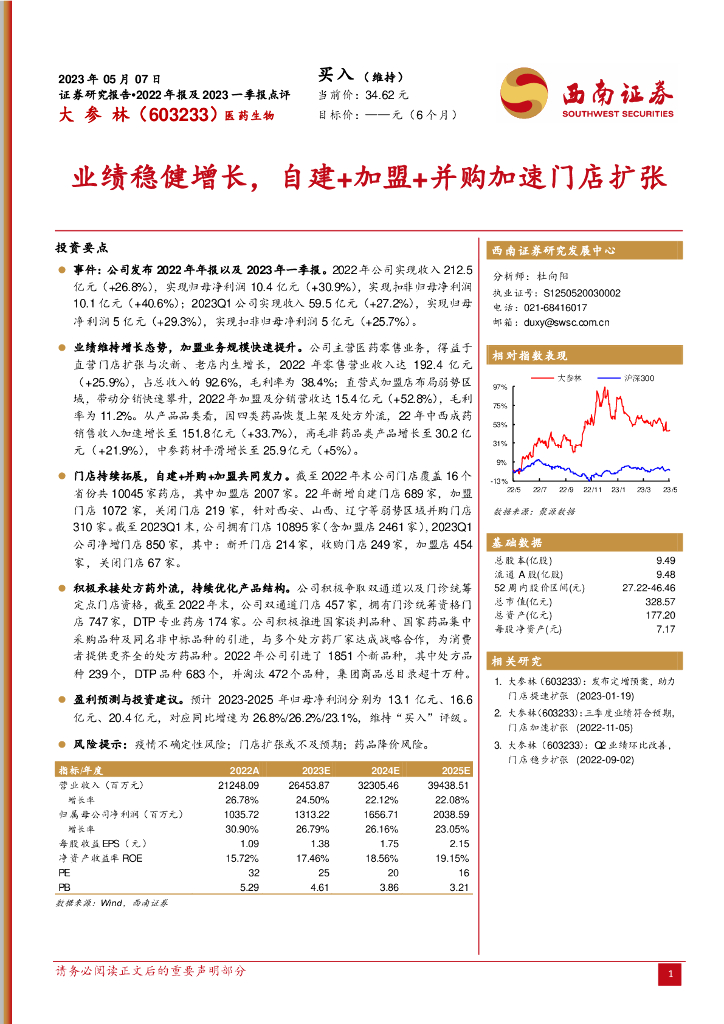 西南证券:大参林(603233)-业绩稳健增长,自建+加盟+并购加速门店扩张.pdf