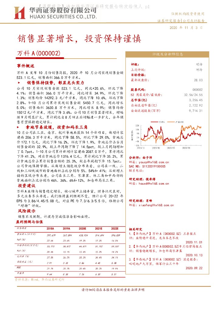 华西证券:万科A(000002)-销售显著增长,投资保持谨慎.pdf