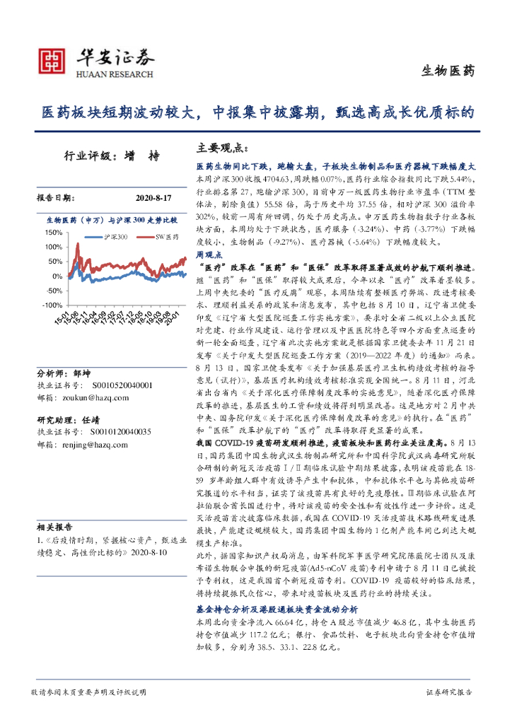 华安证券:生物医药:医药板块短期波动较大,中报集中披露期,甄选高成长优质标的.pdf
