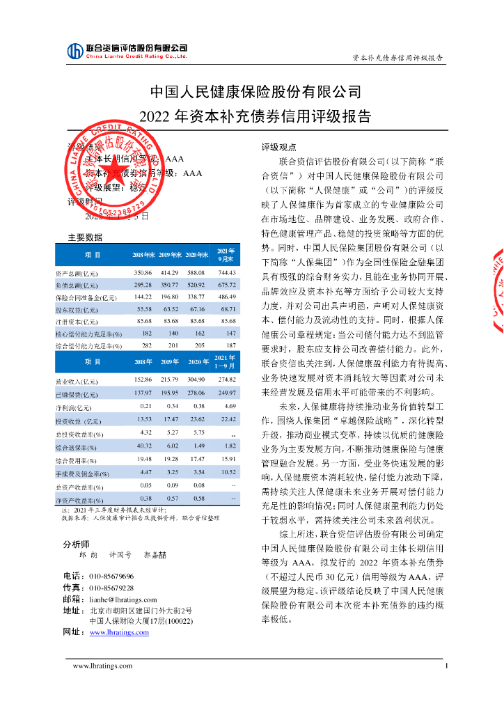 联合资信:中国人民健康保险股份有限公司2022年资本补充债券信用评级报告及跟踪评级安排说明-联合资信.pdf