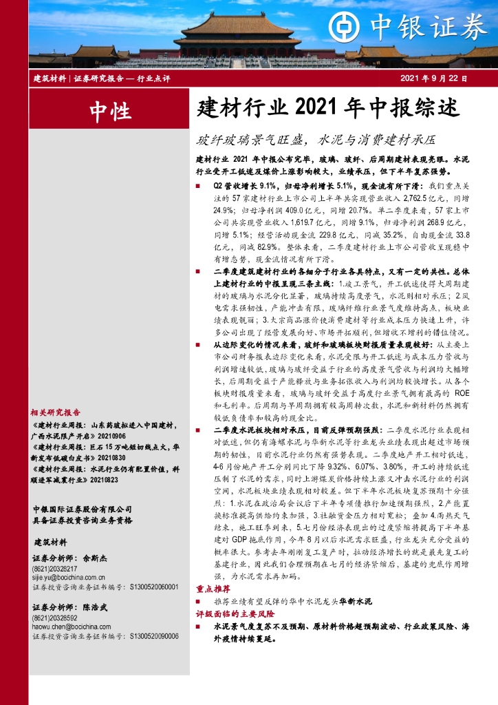 中银证券:建材行业2021年中报综述:玻纤玻璃景气旺盛,水泥与消费建材承压.pdf