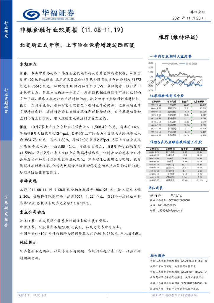 华福证券:非银金融行业双周报:北交所正式开市,上市险企保费增速边际回暖.pdf