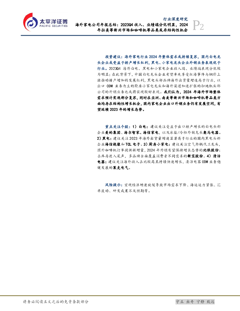 太平洋证券:海外家电公司年报总结:2023Q4收入、业绩端分化明显,2024年拉美等新兴市场和咖啡机等品类或存结构性机会.pdf