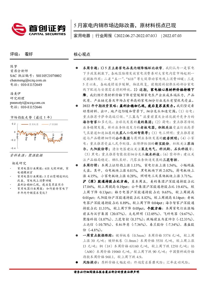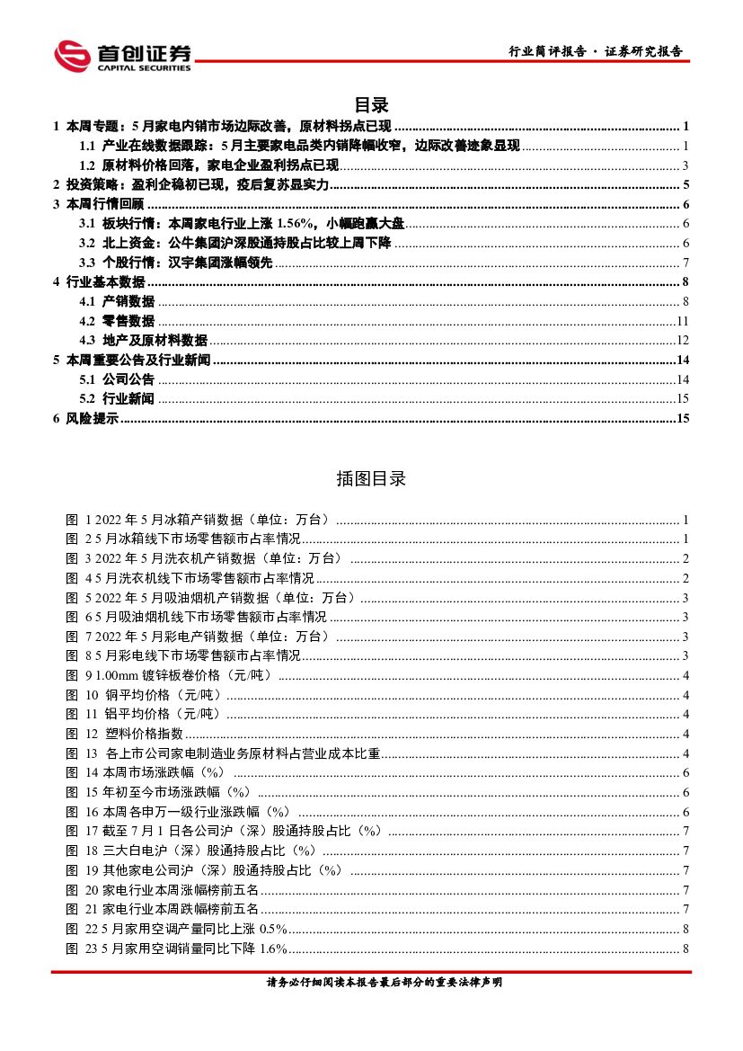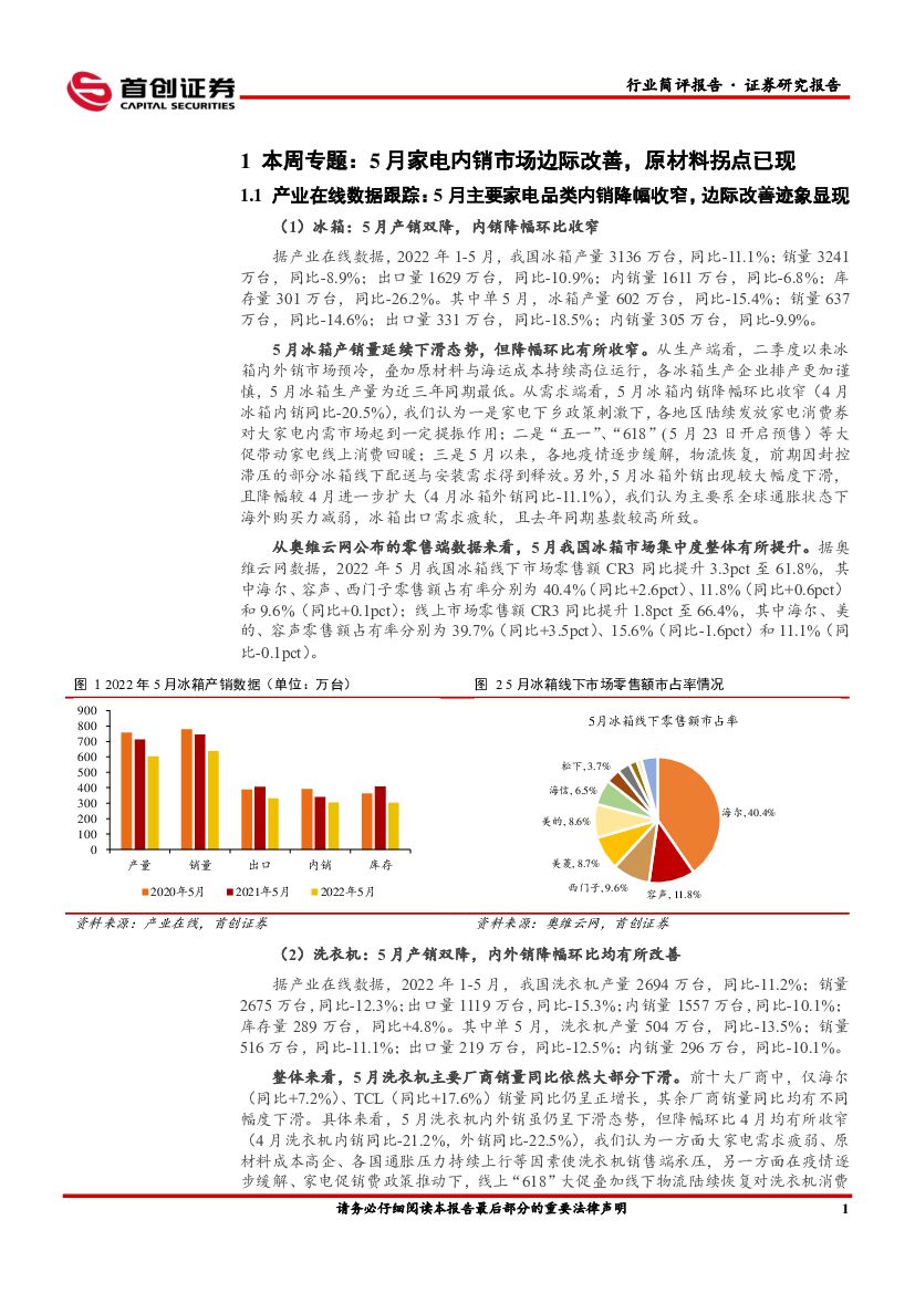 首创证券:家用电器行业周报:5月家电内销市场边际改善,原材料拐点已现.pdf