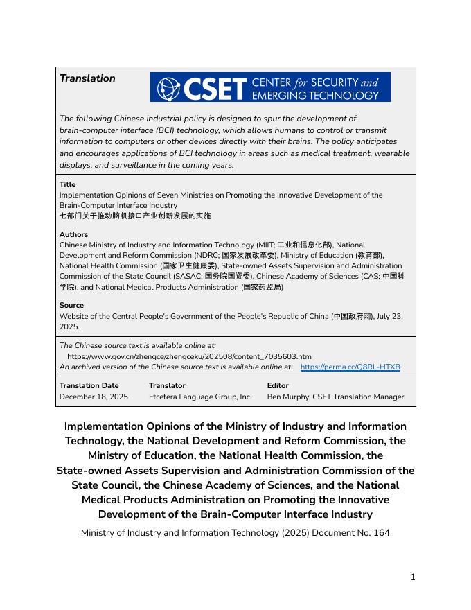 CSET:2025年七部门关于推动脑机接口产业创新发展的实施意见报告(英文版).pdf