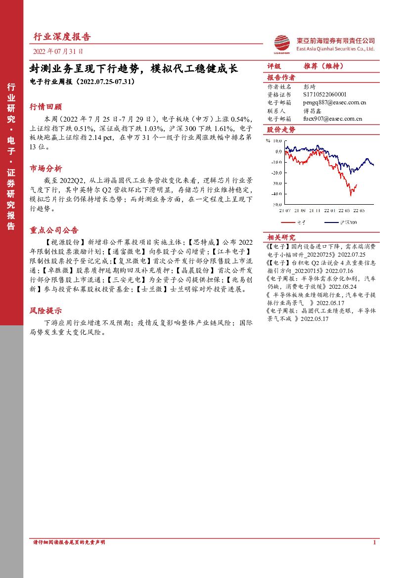 东亚前海证券:电子行业周报:封测业务呈现下行趋势,模拟代工稳健成长.pdf