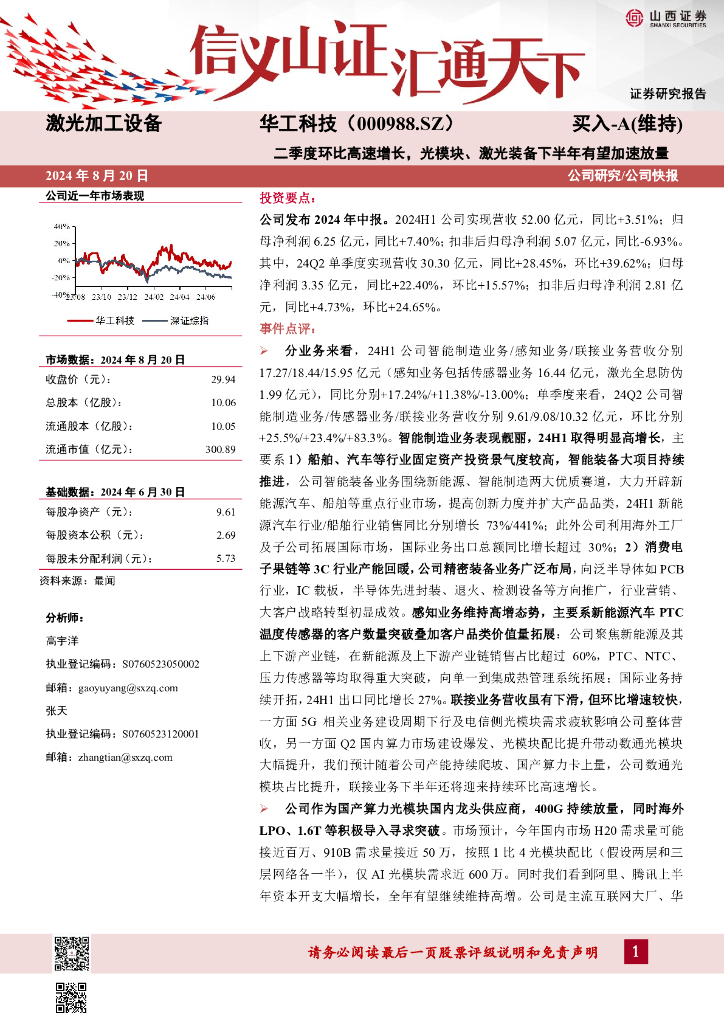 山西证券:华工科技(000988)-二季度环比高速增长,光模块、激光装备下半年有望加速放量.pdf