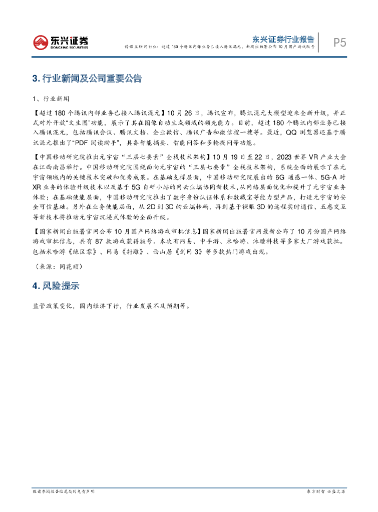 东兴证券:传媒互联网行业报告:超过180个腾讯内部业务已接入腾讯混元,新闻出版署公布10月国产游戏版号.pdf