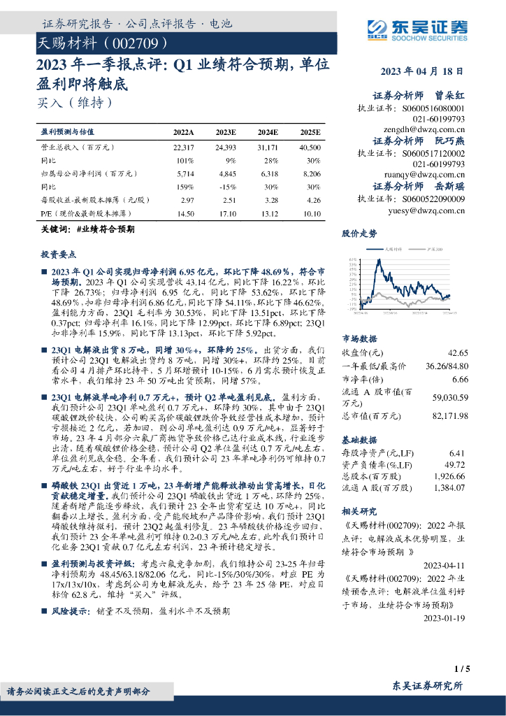 东吴证券:天赐材料(002709)-2023年一季报点评:Q1业绩符合预期,单位盈利即将触底.pdf