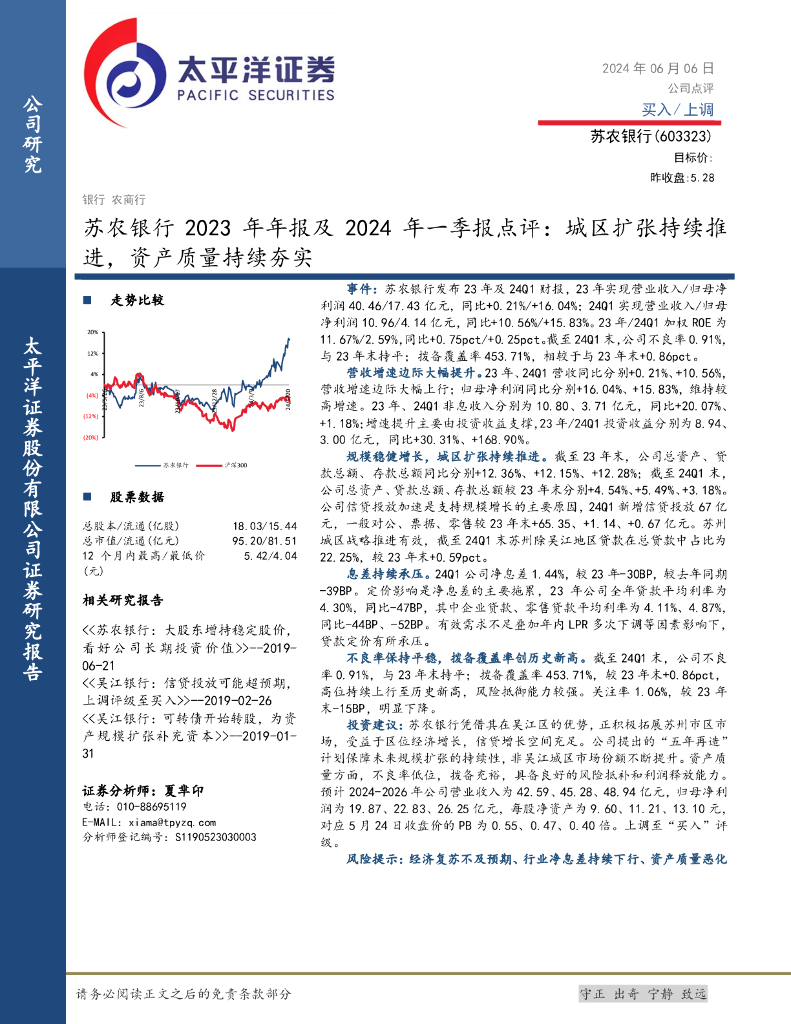 太平洋证券:苏农银行2023年年报及2024年一季报点评:城区扩张持续推进,资产质量持续夯实.pdf