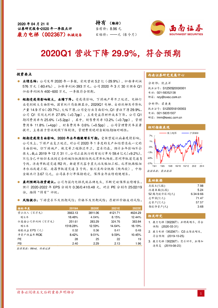 西南证券:康力电梯(002367)-2020Q1营收下降29.9%,符合预期.pdf