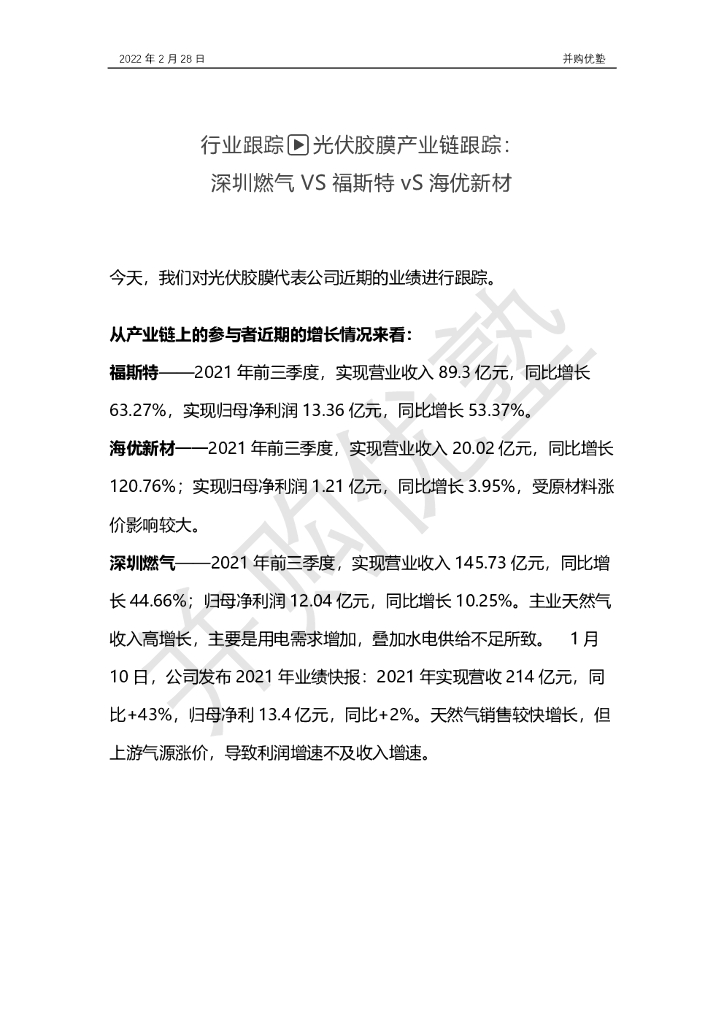 并购优塾:光伏胶膜产业链跟踪:深圳燃气VS福斯特vS海优新材.pdf