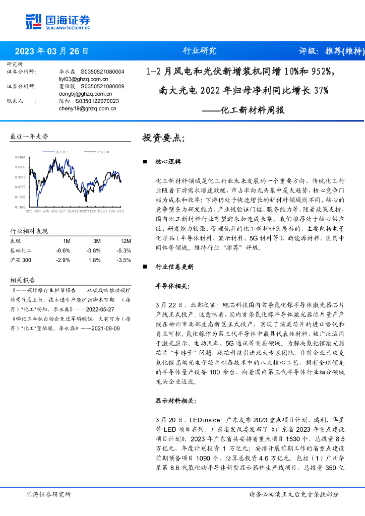 国海证券:化工新材料周报:1-2月风电和光伏新增装机同增10%和952%,南大光电2022年归母净利同比增长37%.pdf