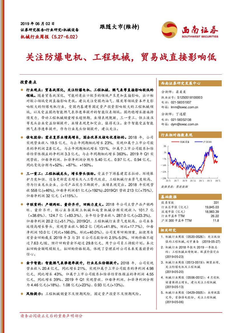 西南证券:机械行业周报:关注防爆电机、工程机械,贸易战直接影响低.pdf