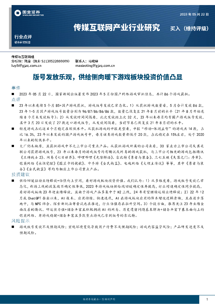 国金证券:传媒互联网产业行业研究:版号发放乐观,供给侧向暖下游戏板块投资价值凸显.pdf