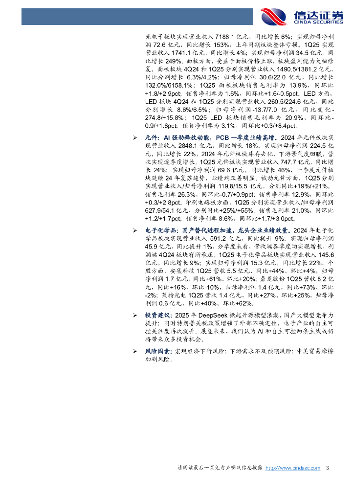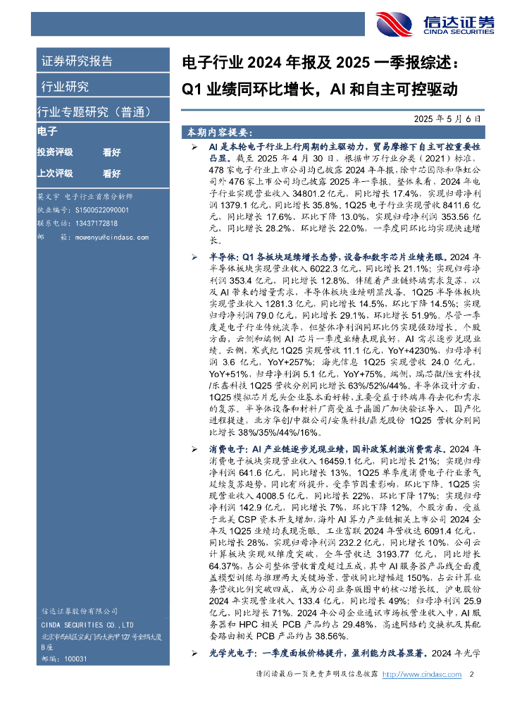信达证券:电子行业2024年报及2025一季报综述:Q1业绩同环比增长,AI和自主可控驱动.pdf