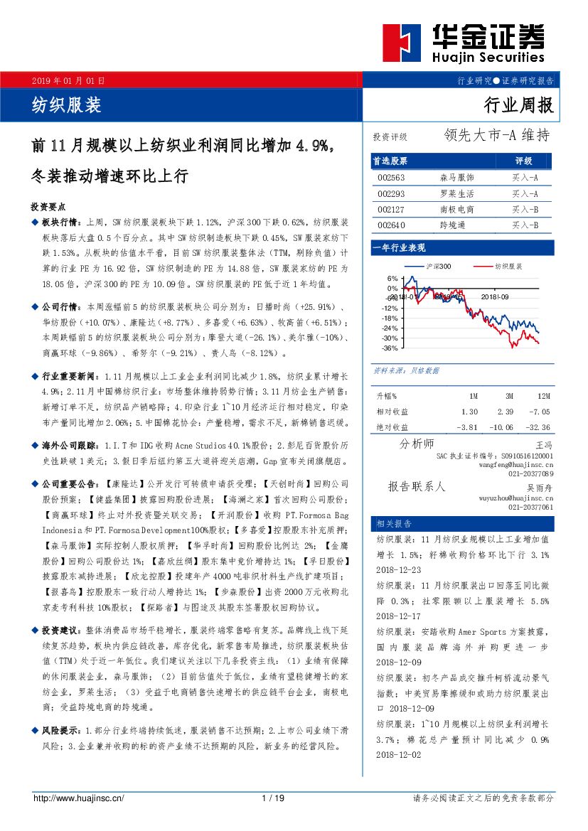 华金证券:纺织服装行业周报:前11月规模以上纺织业利润同比增加4.9%,冬装推动增速环比上行.pdf