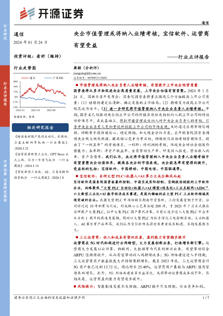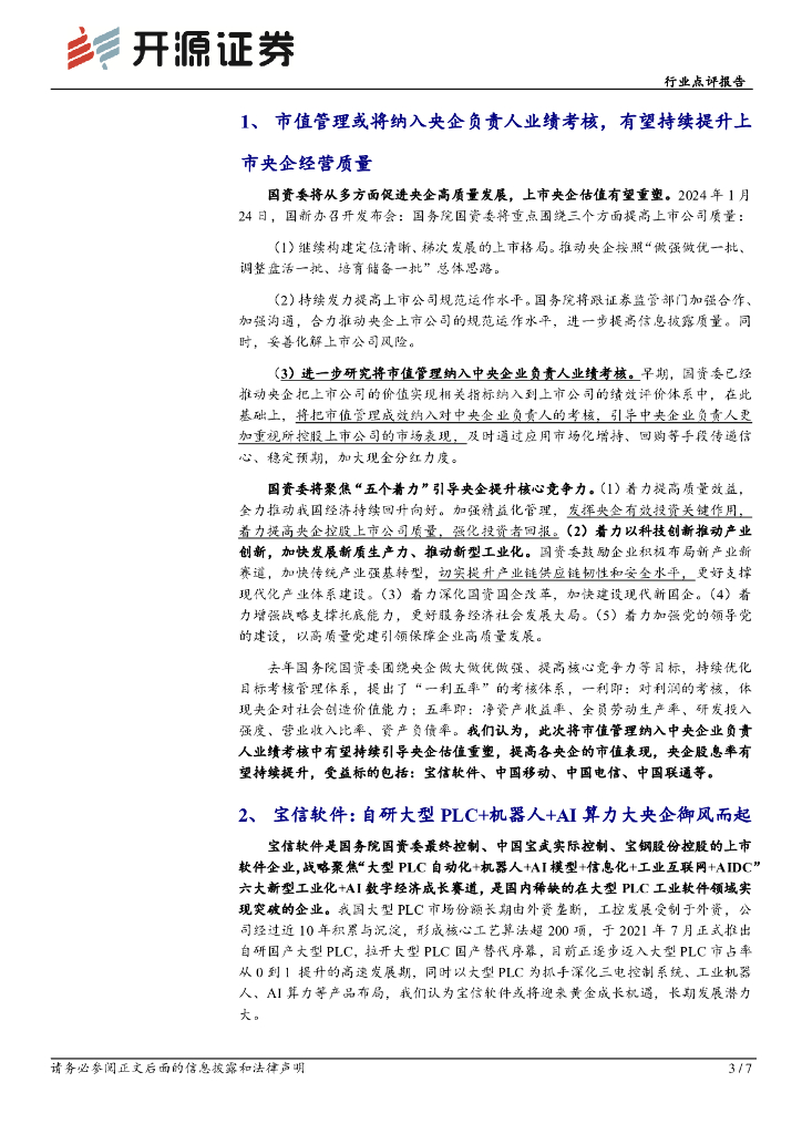 开源证券:通信行业点评报告:央企市值管理或将纳入业绩考核,宝信软件、运营商有望受益.pdf