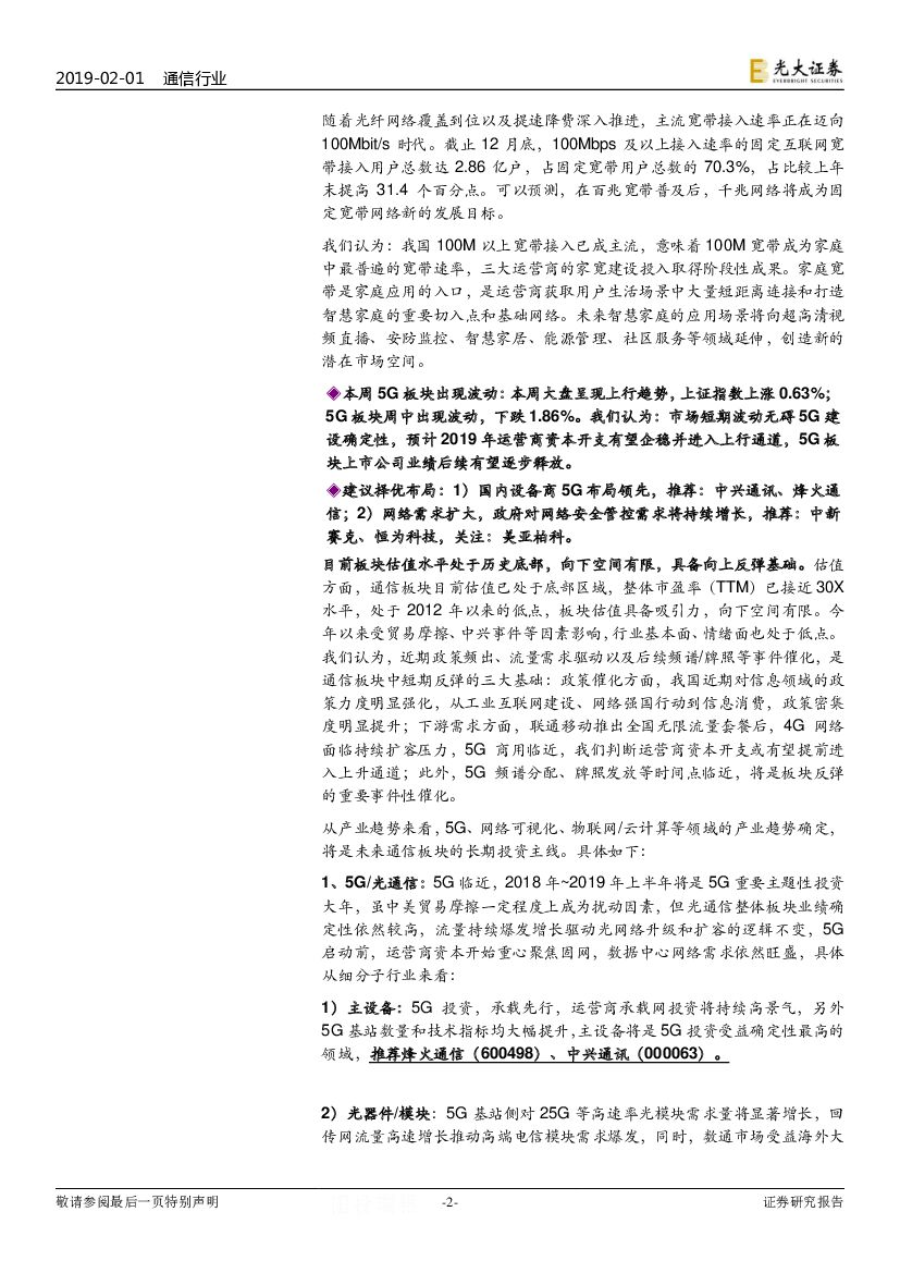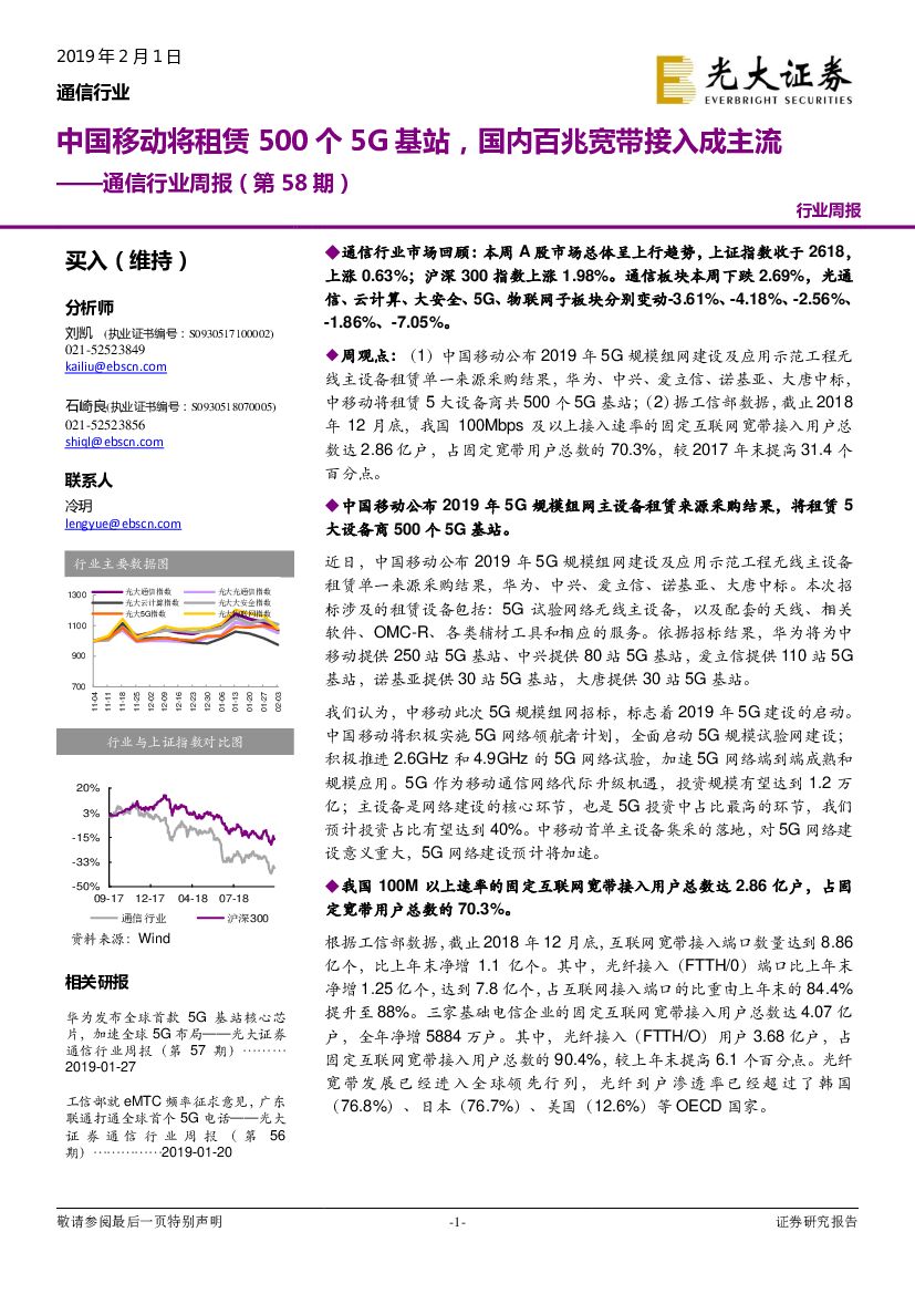 光大证券:通信行业周报(第58期):中国移动将租赁500个5G 基站,国内百兆宽带接入成主流.pdf