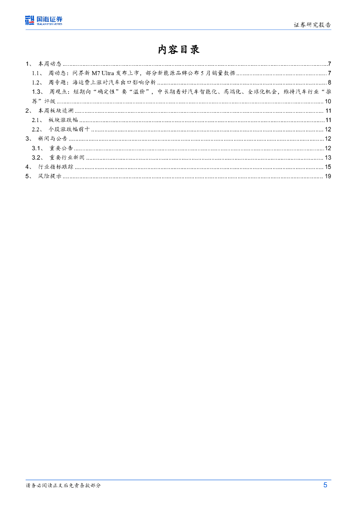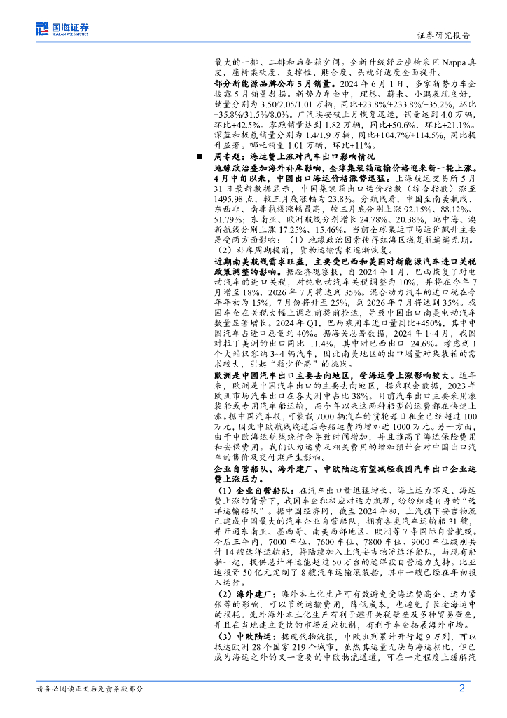 国海证券:汽车行业周报:周动态:问界新M7Ultra发布上市,部分新能源品牌公布5月销量数据周专题:海运费上涨对出口影响分析.pdf
